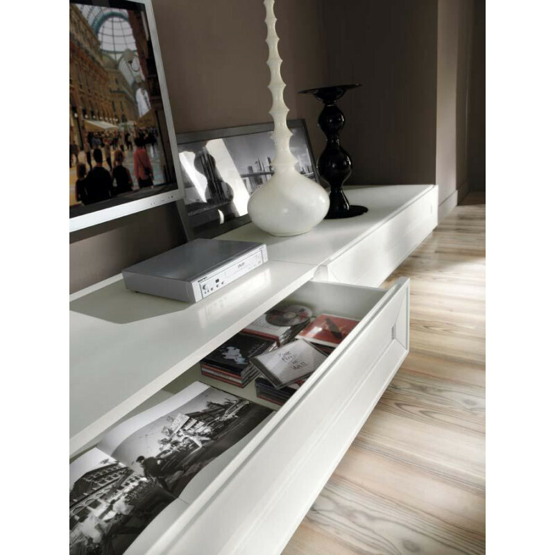 La palette colori e la collezione di materiali sono studiati per soddisfare tutti i gusti e le esigenze: In foto laccato bianco spigolato. Pannello tamburato con telaio in legno o pannello listellare con copertina in mdf. Potrete scegliere il soggiorno tra due colori bianco o grigio. Dock station presente sul top di una.